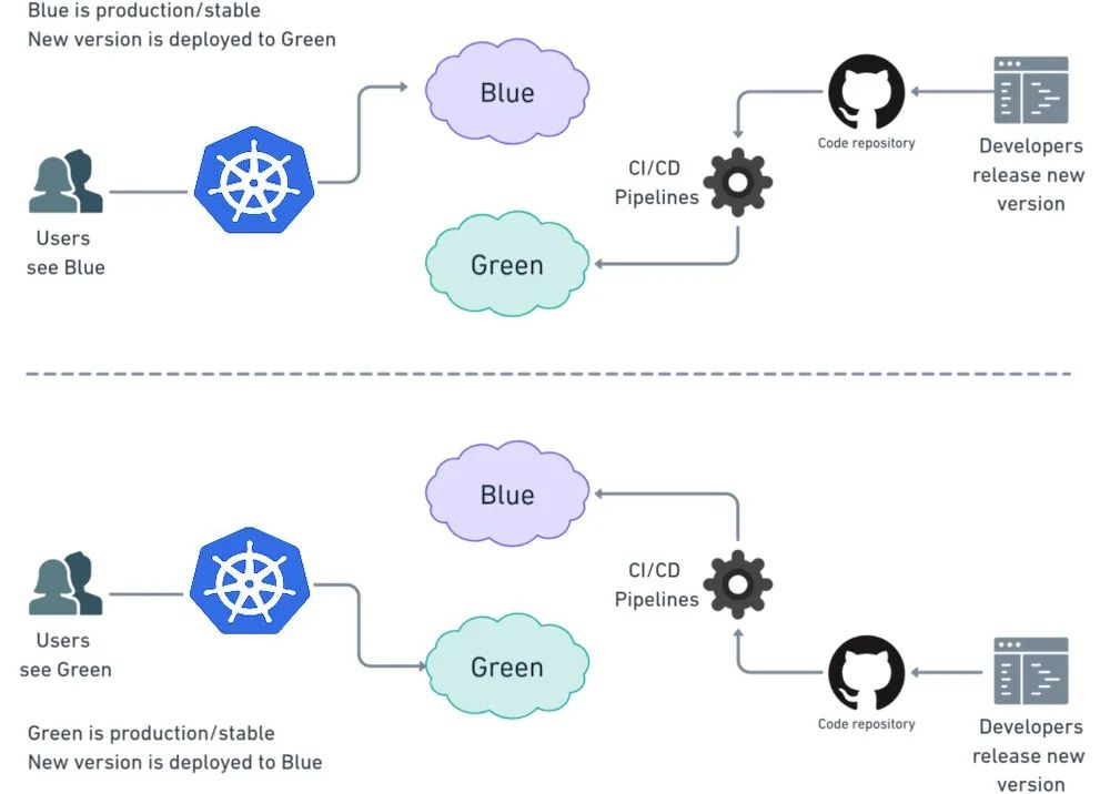 在蓝/绿部署策略(有时也称为红/黑)中,蓝色代表当前应用版本,绿色代表新应用版本。在这种情况下,一次只有一个版本处于活动状态。在创建和测试绿色部署时,流量被路由到蓝色部署。完成测试后,我们将流量路由到新版本。